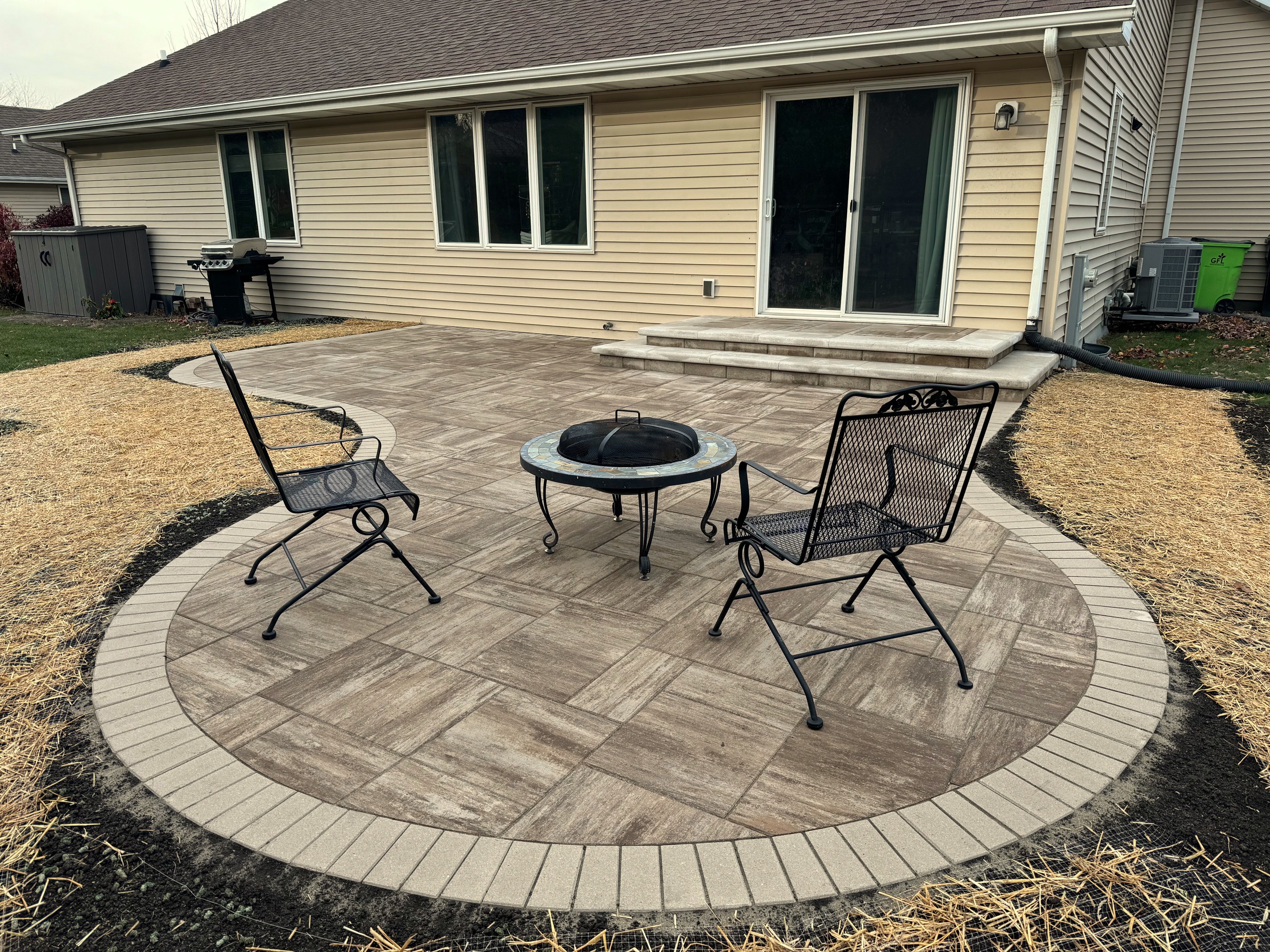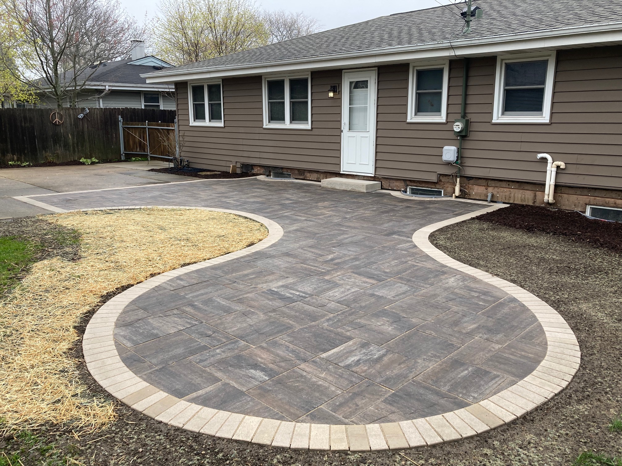 Curvy paver patio installed using County Materials Grand Discover Pavers in Allure. Installed in Caledonia, WI.