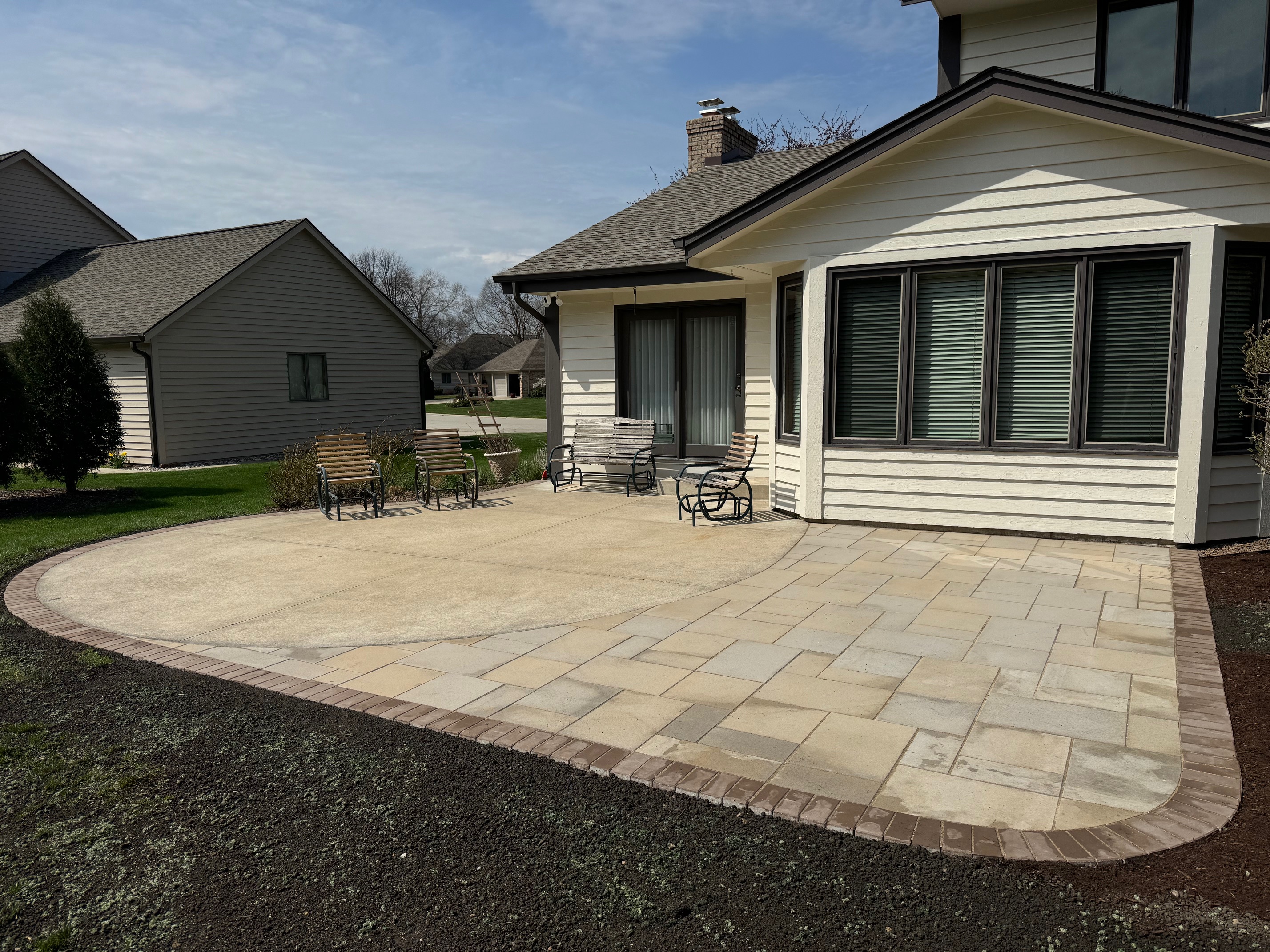 Paver patio extension off existing concrete patio in Mount Pleasant, WI using County Materials Grand Discover pavers (intension color) with beckon colored border.